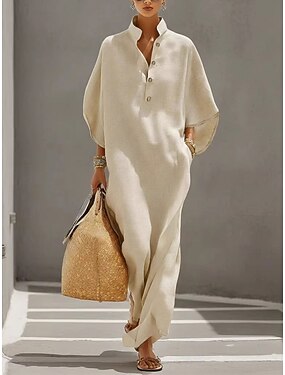 Mulheres Vestido Longo Vestidos Para o Verão Vestido casual Férias Casual Boho Praia Festa Encontro Ajuste Largo Tecido Meia Manga Colarinho Chinês Azul Bege Verão Primavera
