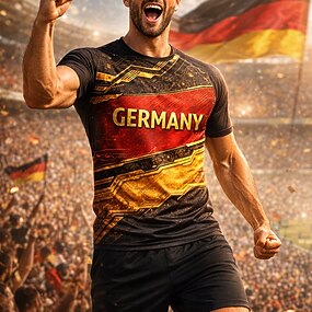 Camisa de futebol masculina inspirada na Alemanha – preta, vermelha e dourada, com estampa tecnológica, tecido de malha respirável de secagem rápida e proteção UPF50+ para fãs do torneio.