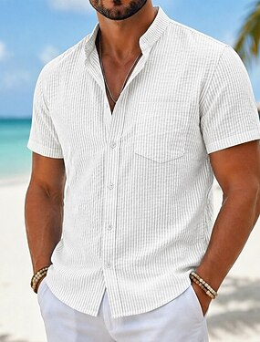 Homens Étnico Camisa Social camisa de botão Manga Curta Casual Tribal Férias Diário Verão Primavera colarinho do vovô Faixa Botões Imprimir Verde Cáqui Damasco Bege
