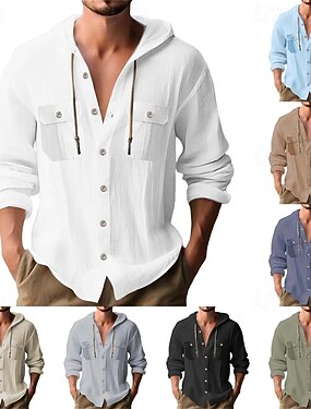 Homens Camisa Social camisa de verão Camisa casual camisa de praia camisa de botão Marron Escuro Preto Branco Azul Marinha Azul Céu Manga Longa Tecido Com Capuz Férias Casual Bolsos Roupa Moda Casual