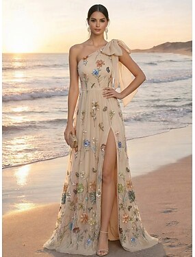Tubinho Vestidos Longo Vestido de convidada de casamento Vestido formal Vestido de noite Vestido Para Mãe dos Noivos Sem Manga Ombro a Ombro Elegante Simples Minimalista Formal Renda com Flores 3D