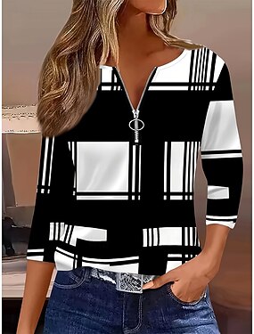 Mulheres Camiseta Zíper Imprimir Gráfico Geométrica Xadrez Vintage à moda Clássico Manga Longa Gola Redonda Decote V Tops regulares Diário Final de semana Branco e Preto Outono Inverno
