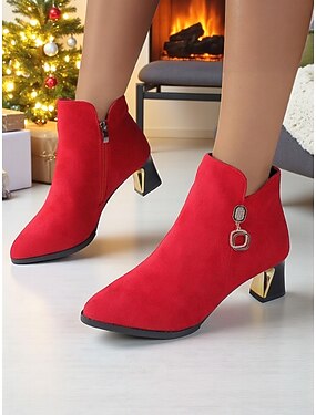 Botas femininas de camurça vermelha com salto bloco dourado e zíper lateral, botas estilosas de inverno para festas de Natal &roupas do dia a dia