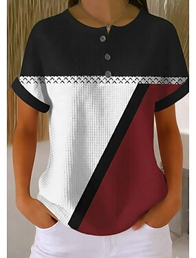 Blusas Tricot Texturizadas em Waffle Femininas T Shirt com Estampa em Blocos de Cores Gráfica Geométrica Estilosa Clássica de Manga Curta Gola Careca Redonda para Esportes Diários de Fim de Semana