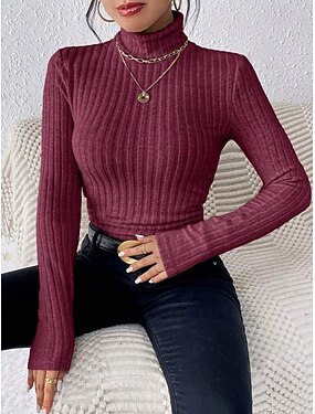 Mulheres Suéter Casual Macia Cor imaculada Estriado Gola Alta Tricotado Manga Longa Tops regulares Tricotar Ao ar livre Diário Final de semana Preto Vinho Outono Inverno