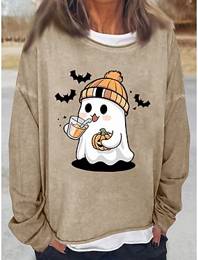 Moletons Femininos Casual Manga Longa Gola Redonda Tops Regulares Impressão Casual Preto Branco Rosa Caqui Cinza Outono Inverno