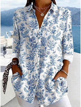 Mulheres Camisa Social Botões Imprimir Floral Gráfico Elegante Vintage Tropical Manga Longa Colarinho de Camisa Tops regulares Diário Trabalho Azul Rosa Vermelho Verão Primavera