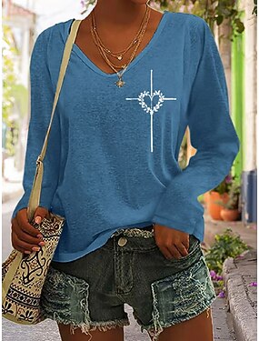 Dia dos Namorados Mulheres Camiseta Imprimir Coração Gráfico Vintage à moda Clássico Manga Longa Decote V Tops regulares Diário Azul Preto Branco Primavera Outono