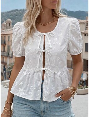 Mulheres Camisa Social Camisa Pointelle Topo de ilhó Blusa Ilhó Botões Tecido Vintage à moda Clássico Manga Curta Assimétrico Tops regulares Casual Diário Praia Preto Branco Rosa Vinho Azul Marinha