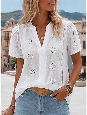 Mulheres Blusa Textura Topo de ilhó Camiseta Pointelle Blusa Vazado Tecido Vintage à moda Manga Curta Decote V Tops regulares Casual Diário Praia Azul Preto Branco Rosa Vinho Verão Primavera