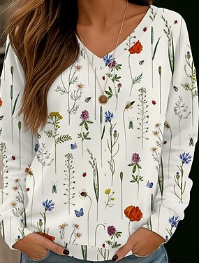 Mulheres Moletom Imprimir Floral Roupa de rua Casual Manga Longa Decote V Tops regulares Rua Feriado Para Noite Branco Amarelo Vermelho Verde Outono
