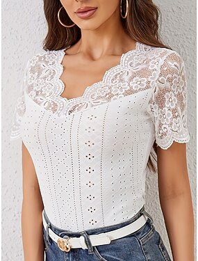 Mulheres Blusa Tops de renda Renda Patchwork Tecido à moda Clássico Moderno Manga Curta Decote V Tops regulares Diário Feriado Para Noite Preto Branco Rosa Vermelho Roxo Verão Primavera Outono