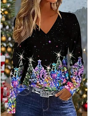 Camiseta Feminina de Natal Graphic Vintage Estilosa Clássica Manga Longa Decote em V Tops Regulares Impressão Diária Cinza Vermelho Preto+Branco+Vermelho Vinho Verde Escuro Primavera Outono Inverno
