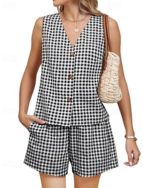 Mulheres Conjuntos de shorts Bolero Top Sem Manga Decote V Xadrez Ativo Roupa de rua Diário Ao ar livre Azul Preto Vermelho Verão Normal