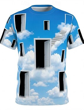 Camiseta masculina surrealista de manga curta com gola redonda, estampa total, portas surreais no céu, nuvens e escadas, estilo dreamcore/weirdcore, modelagem regular, streetwear casual, ideal para