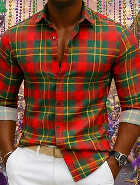 Carnaval Homens Gráfico Xadrez Camisa Social camisa de botão camisa de praia Manga Longa Havaiana Casual Confortável Férias Feriado Carnaval Verão Primavera Aberto para a Lateral Estampado Vermelho 1