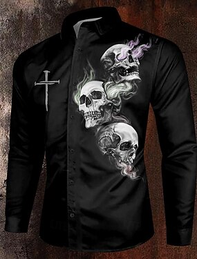 Camisa Masculina de Fantasia Caveira Cristã Botão Camisa de Manga Longa Casual Escura Para Festa Noturna Diária Outono Inverno Primavera e Verão Camisa de Colarinho Botão 3D Impressão Preto