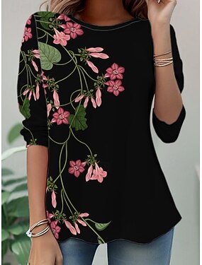 Mulheres Camiseta Imprimir Floral Gráfico Plantas à moda Clássico Moderno Manga Longa Gola Redonda Tops longos Diário Final de semana Roupas de férias Azul Preto Branco Verde Verão Primavera