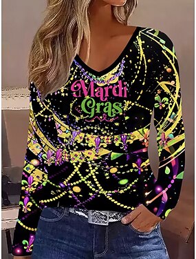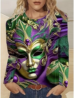 Camiseta Feminina de Carnaval Gráfica Vintage Fashion Estilosa de Manga Longa Gola Careca Regular Tops Diários de Final de Semana Impressão Verde Verão Primavera Outono