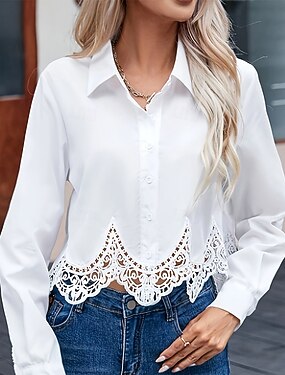 Blusas Brancas Elegantes de Renda Feminina Blusa de Ilhós Blusas Regulares Casuais de Cor Sólida de Manga Longa Decote em V Patchwork de Renda Ajuste Regular Diárias Pretas Brancas Rosas Românticas