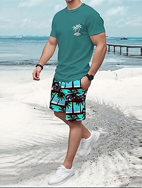 Homens Palmeira 2pcs Conjuntos de camisetas Tops de verão Manga Curta Calças curtas Gola Redonda Férias Casual Diário férias na praia Impressão 3D Verão Verde