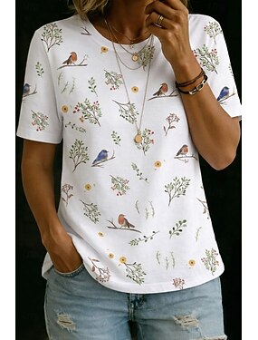 Mulheres Camiseta Imprimir Floral Gráfico Pássaro à moda Básico Clássico Manga Curta Gola Redonda Tops regulares Diário Azul Branco Rosa Verão Primavera
