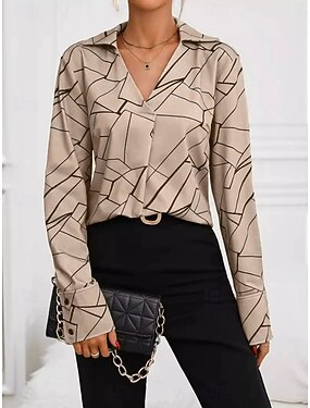 Mulheres Blusa Imprimir Geométrica Elegante à moda Básico Manga Longa Decote V Tops regulares Diário Escritório Trabalho Preto Cáqui Verão Primavera Outono