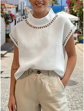 Mulheres Blusa Vazado Tecido Básico Casual Manga Curta Gola Alta Tops regulares Diário Feriado Para Noite Branco Verão Primavera
