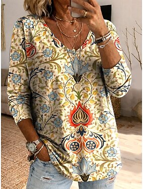 Mulheres Camiseta Boho Camiseta T-shirt Imprimir Floral Gráfico Vintage Étnico Casual Manga Longa Decote V Tops regulares Diário Final de semana Roupas de férias Laranja Verão Primavera Outono
