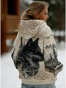 Mulheres Pulôver Moletom Com Capuz Gráfico Animal Tribal Elegante Punk Vintage Manga Longa Com Capuz Tops regulares Casual Casa Rua Preto Branco Bege Outono