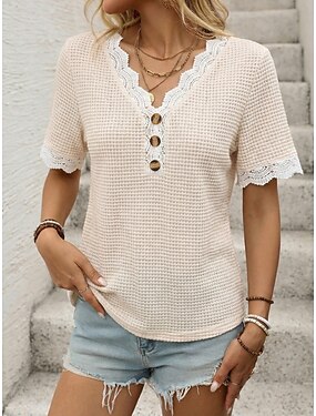 Mulheres Blusa Renda Patchwork Botões Côr Sólida à moda Casual Manga Curta Decote V Tops regulares Diário Damasco Verão Primavera