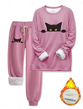 Conjunto de Pijamas Feminino Forrado em Fleece 2 Peças Moletom Roupas de Treino Quente Conforto Macio Pullover Manga Longa Calça Longa Gola Redonda Letra Cintura Elástica Casa Diária Cama Rosa Escuro