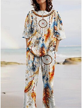 Mulheres Conjuntos de calças Manga 3/4 Gola Redonda Gráfico Imprimir Boêmia Férias Diário Férias Feriado Cáqui Verão Normal