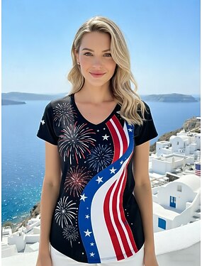 Dia da Independência Americana Mulheres Camiseta T-shirt Imprimir Gráfico à moda Clássico Casual Manga Curta Decote V Tops regulares Diário Para Noite Final de semana Azul Preto Branco Vermelho Verde