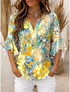 Mulheres Blusa Imprimir Floral Gráfico Vintage à moda Moderno Manga 3/4 Decote V Tops regulares Casual Diário Feriado Azul Amarelo Rosa Verde Verão Primavera