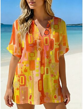 Mulheres Camisa Social Camisa casual camisa de praia Blusa Imprimir Gráfico Geométrica à moda Clássico Moderno Manga Curta Decote V Tops regulares Diário Feriado Para Noite Azul Amarelo Verão
