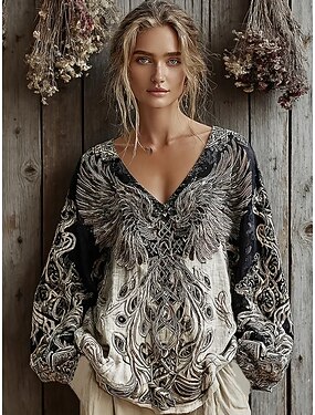 Camisa de Linho Feminina Como Algodão Falso Estampa Patchwork Floral Gráfica Abstrata Elegante Boêmia Vintage de Mangas Longas Decote V Tops Regulares Diários Férias Preto e Branco Verão Primavera
