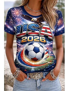 Camiseta Feminina World Soccer Match 2026 Impressão Gráfica Estilosa Clássica Casual Manga Curta Gola Redonda Tops Regulares Diários Esportivos Azul Preto Branco Verão Primavera