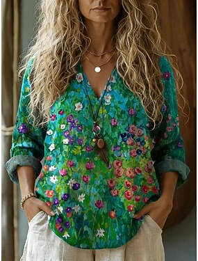 Blusa Feminina Linho Semelhante Respirável Leve Floral Gráfico Vintage Dia a Dia Estilosa Manga Longa Decote em V Long Tops Dia a Dia Férias Impressão Verde Caqui Verão Primavera