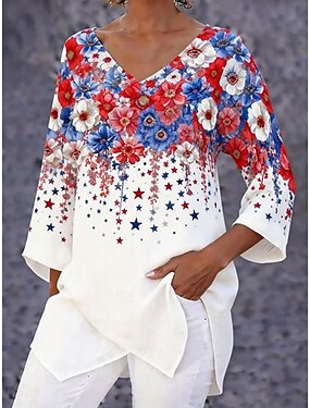 Dia da Independência Americana Mulheres Blusa Imprimir Floral Gráfico Vintage à moda Básico Manga 3/4 Decote V Tops regulares Diário Feriado Azul Verão Primavera Outono