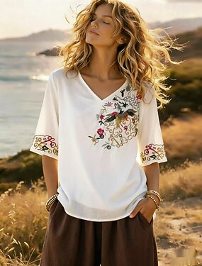 Mulheres Blusa Linho de algodão sintético Bordado Imprimir Floral Ativo Vintage Meia Manga Decote V Tops regulares Diário Feriado Para Noite Preto Branco Vinho Verde Verão Primavera
