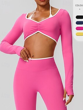 Mulheres Tops Camada de base Tops de ioga Decote em V Secagem Rápida Esticar Pavio Humido Acolchoado Manga Longa Esportes Côr Sólida Blusas Para Corrida Ginástica Ioga Ajuste justo Roupas Esportivas