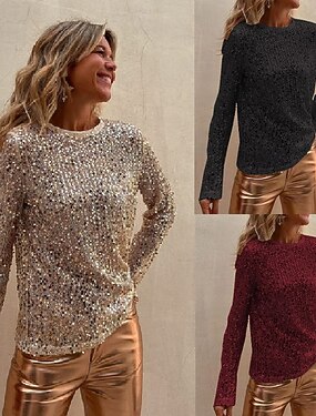 Mulheres Blusa Paetês Côr Sólida Ativo à moda Casual Manga Longa Gola Redonda Tops regulares Diário Preto Vinho Bege Primavera Outono Inverno
