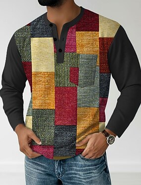 Homens Gráfico Retalhos Camisa Henley Camiseta Manga Longa Retro Vintage Casual Casual Primavera Outono Preto Vermelho Escuro Marron Henley Camiseta Henley