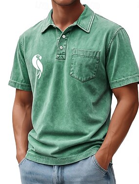 Homens Animal Modelado Camisa Acid Wash 100% Algodão Manga Curta Camisas polo Lapela Casual Roupa Esportiva Bolsos Impressão 3D Botões Primavera Verão Azul Marron Verde