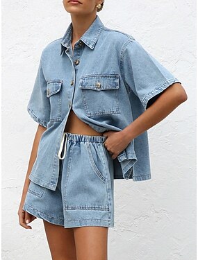 Mulheres Conjuntos de shorts Bolero Top Manga Curta Colarinho de Camisa Tecido Moda Roupa de rua Casual Diário Ao ar livre Azul Preto Azul Marinha Verão Normal