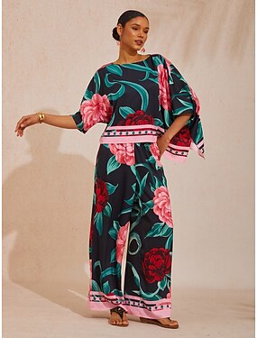 Blusa de cetim com mangas dolmã e estampa floral artística para férias
