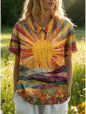 Blusa feminina com botões, estampa gráfica de sol, ideal para férias, uso diário casual, manga curta, tecido texturizado, gola de camisa, blusa regular para o dia a dia, feriados, passeios, cor
