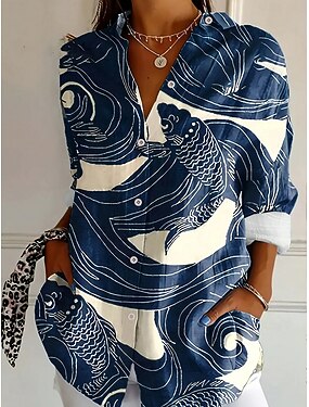 Camisa Feminina Linho Como Respirável Leve Botão Para Baixo Camisa Tunica Gola Manga Longa Gráfico Animal Elegante Vintage Tropical Dia a Dia Praia Estampa Preta Rosa Azul Primavera Outono