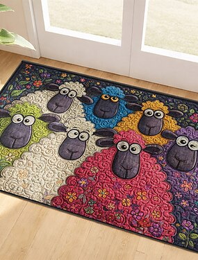 Tapete de boas-vindas com estampa de ovelhas bordadas falsamente, seis ovelhas coloridas de lã em um tapete de boas-vindas floral.